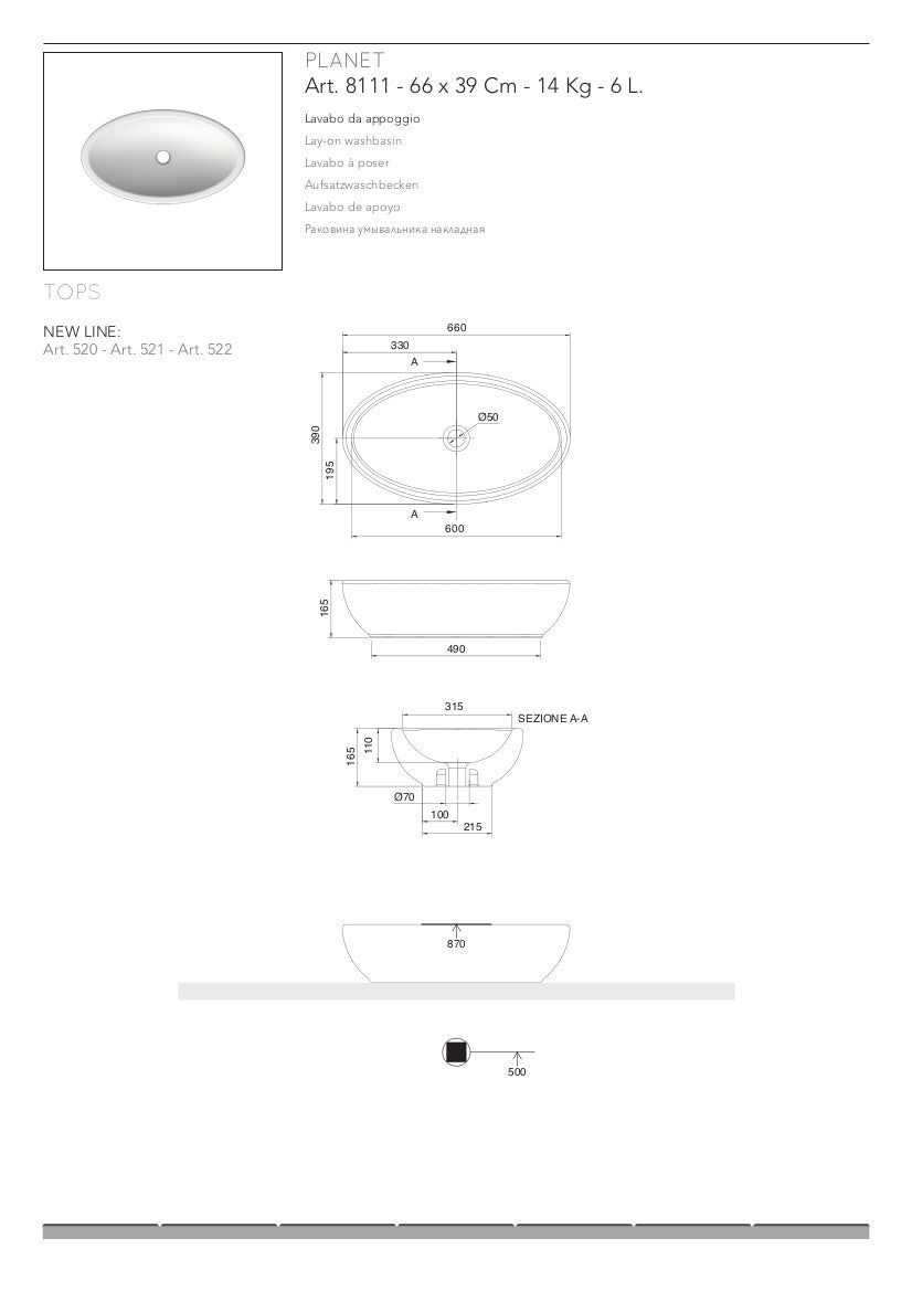 Lavabo ovale Planet in ceramica bianca, senza foro per rubinetto e senza troppopieno. Può essere installato solo su un mobile, un piano in legno e una panca.