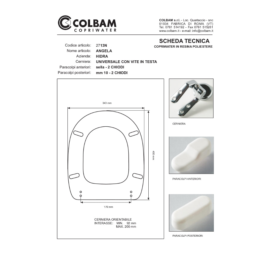 Abattant de toilettes en résine polyester blanche pour la gamme Angela de Hidra, longueur 40 cm, largeur 34,3 cm, entraxe min. 9,2 cm - max. 20 cm