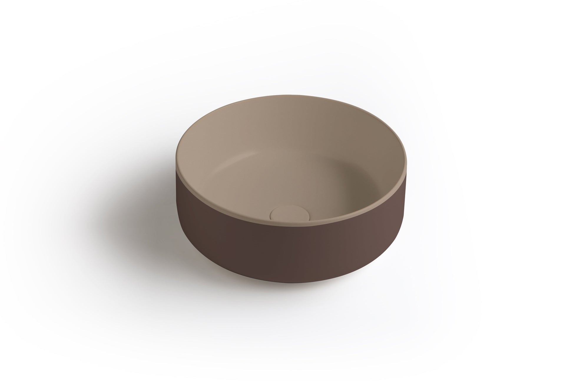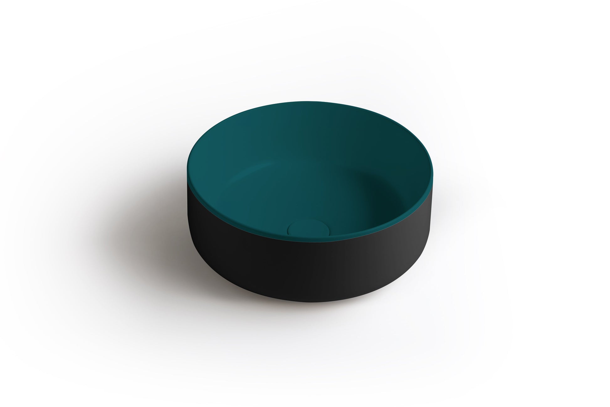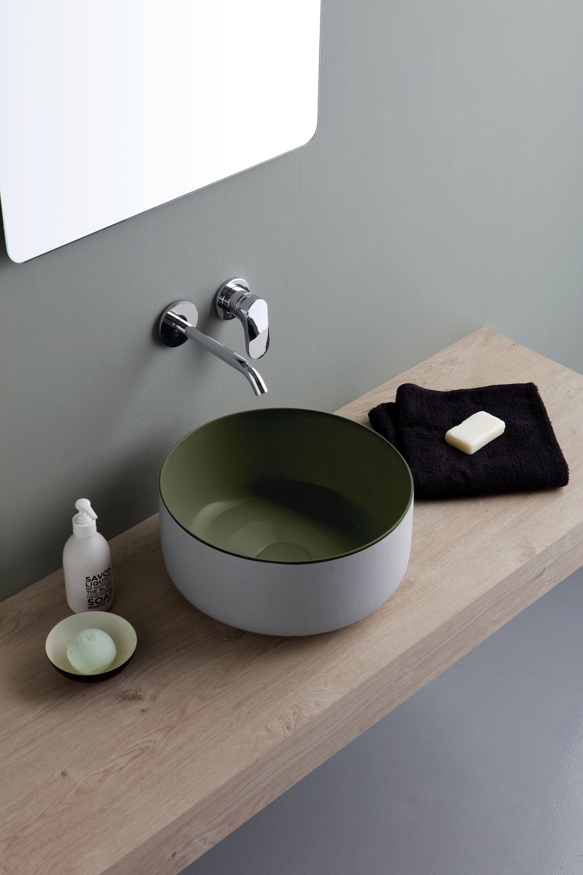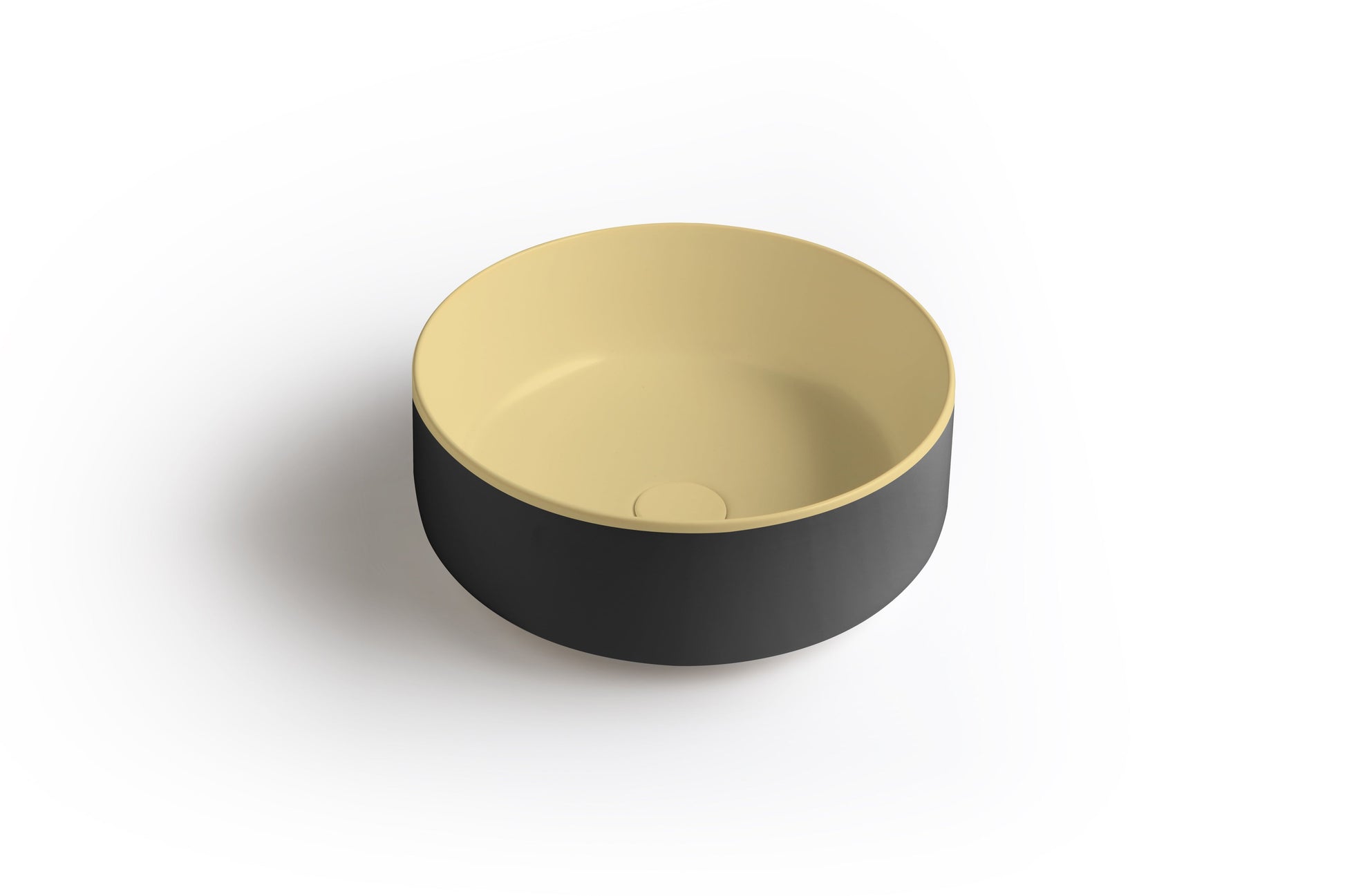 Keramikwaschbecken für die Arbeitsplatte, Außenseite aus Öko-Mörtel mit Betonoptik, Keramikbecken in verschiedenen Farben.