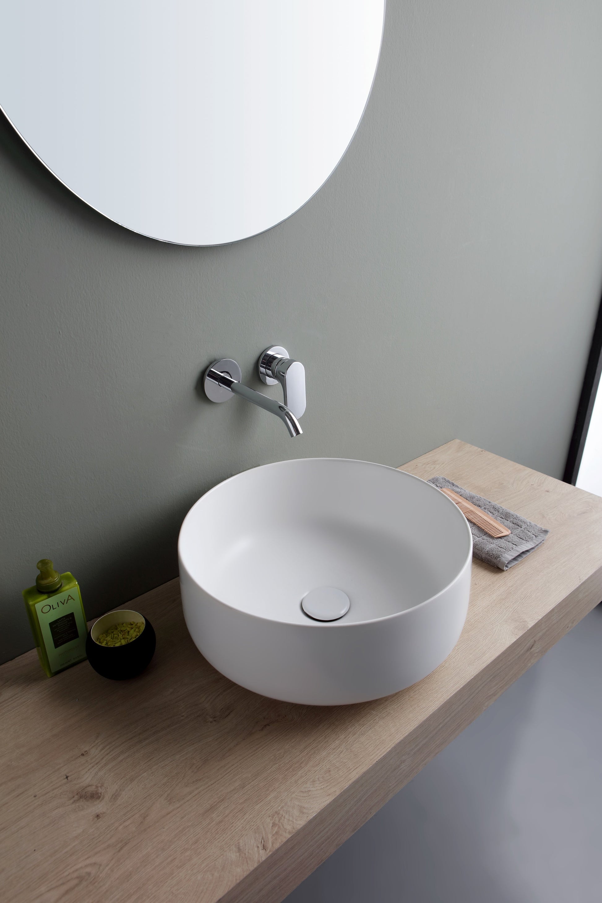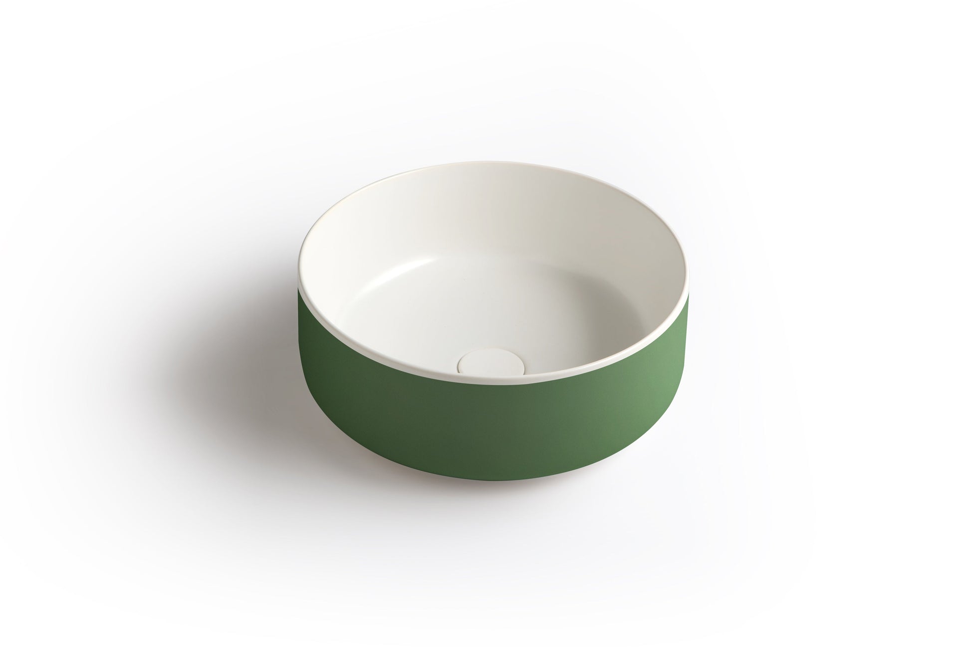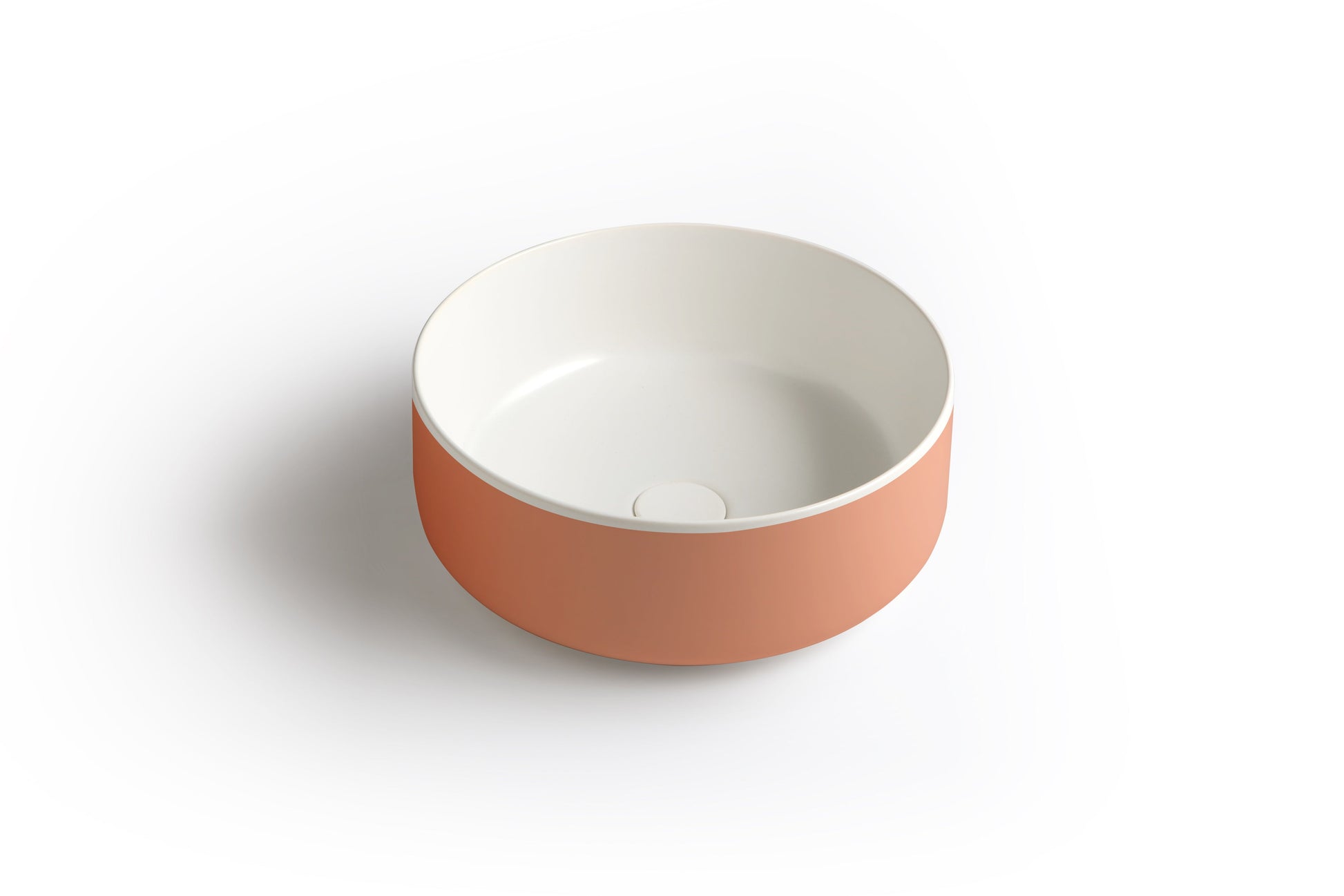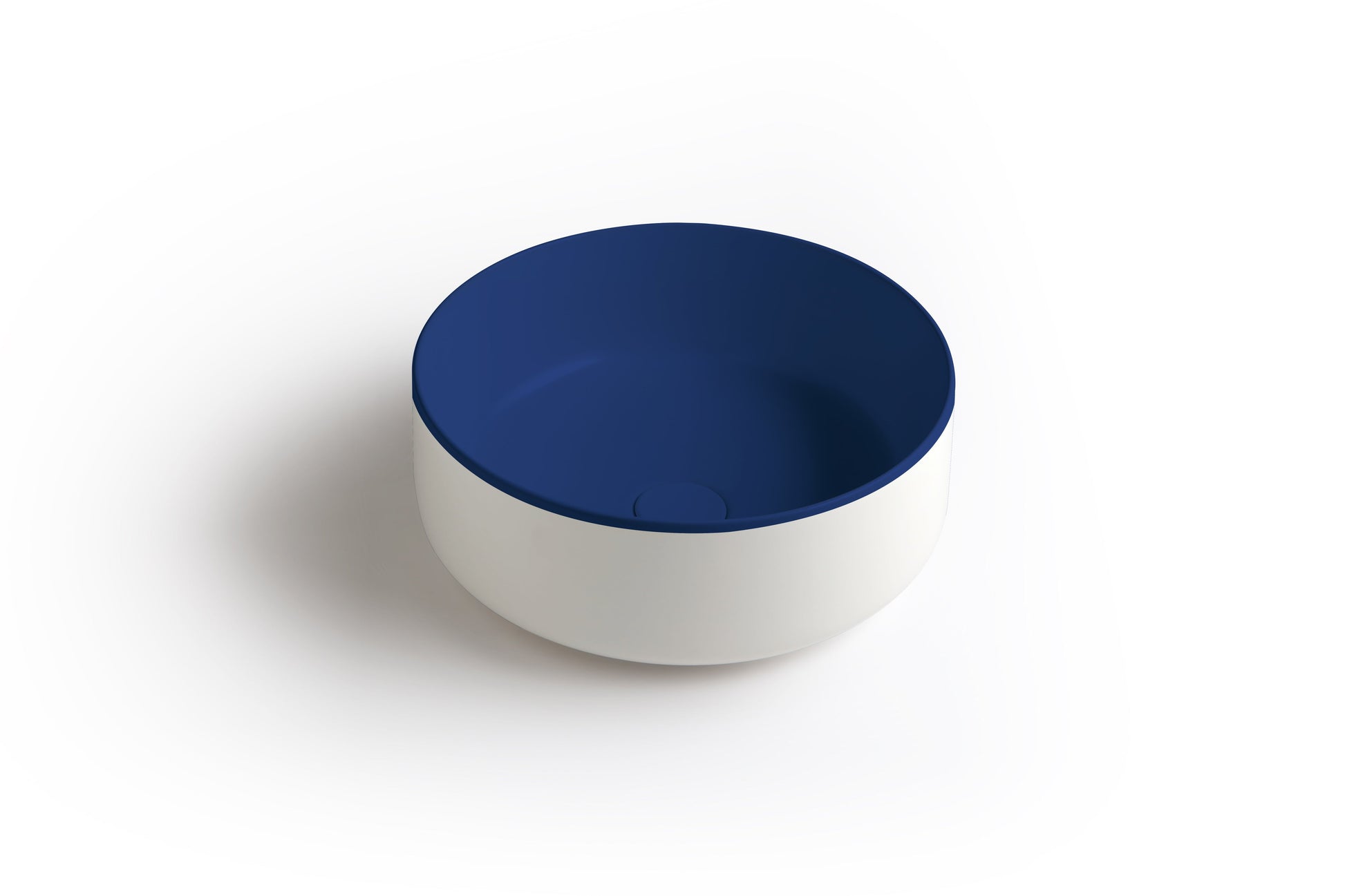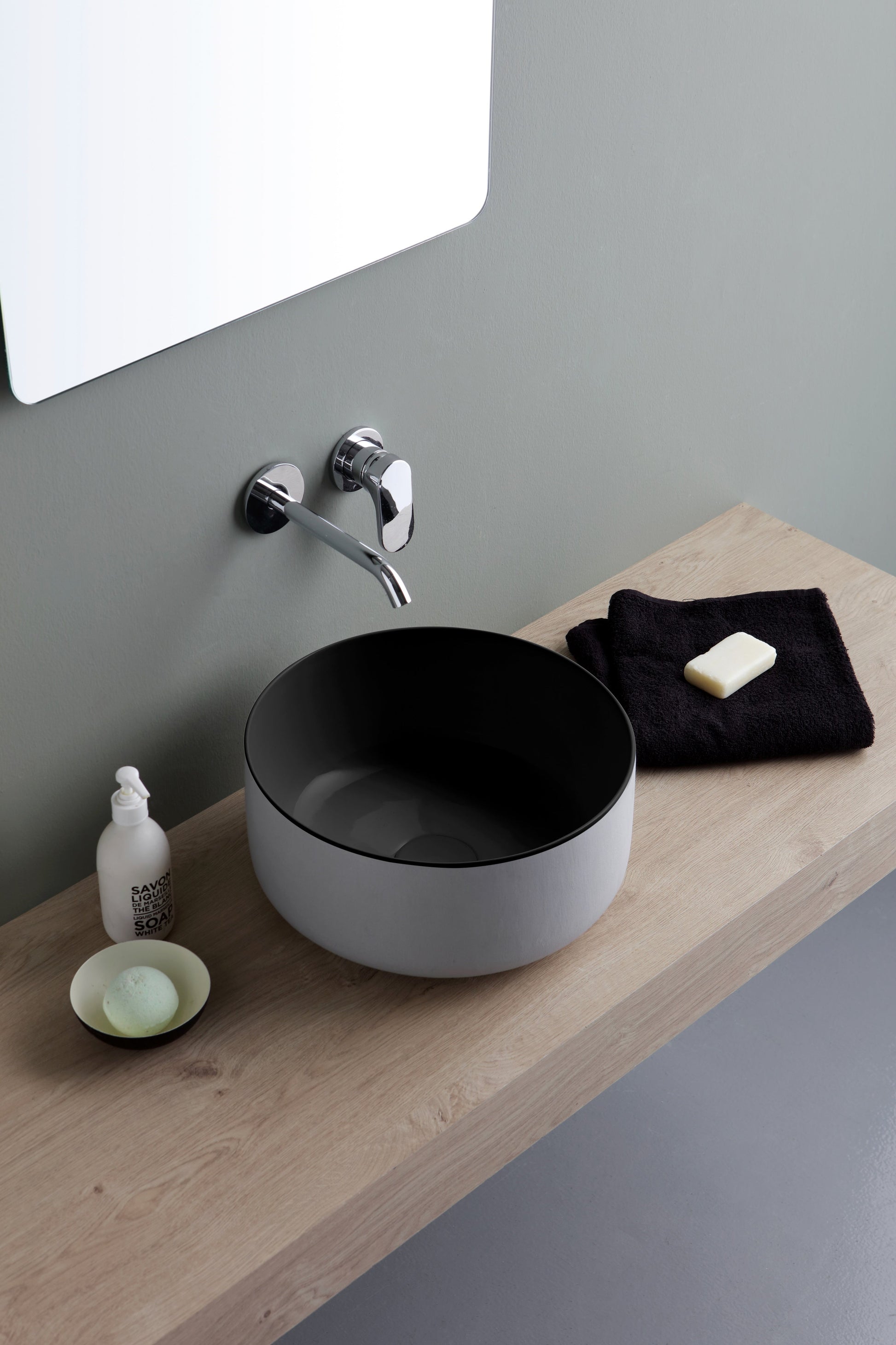 Keramikwaschbecken für die Arbeitsplatte, Außenseite aus Öko-Mörtel mit Betonoptik, Keramikbecken in verschiedenen Farben.