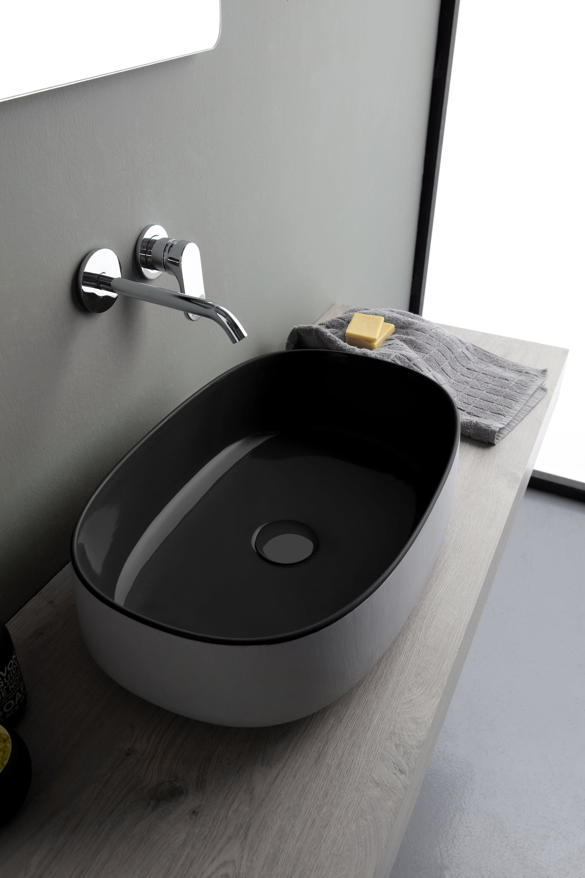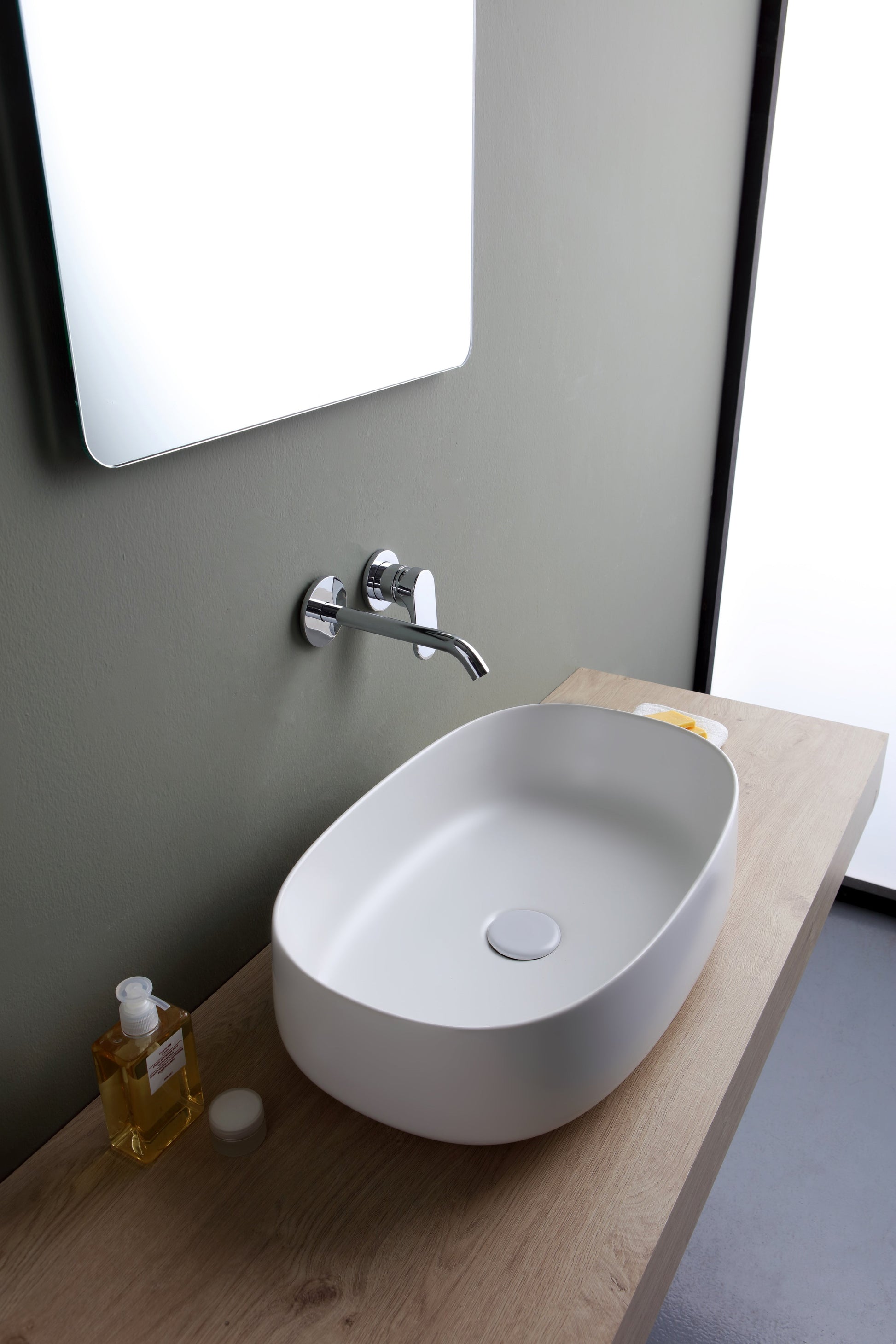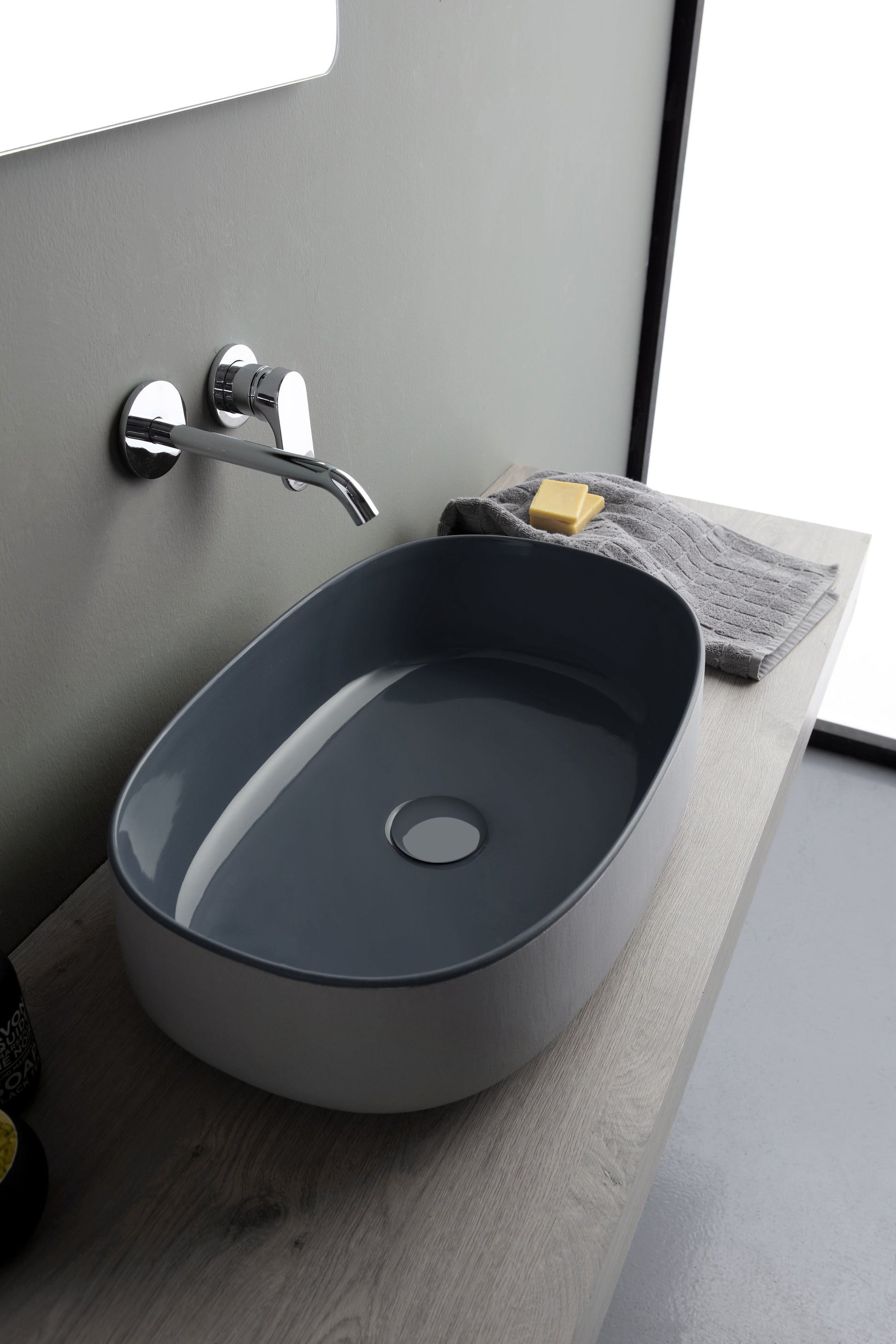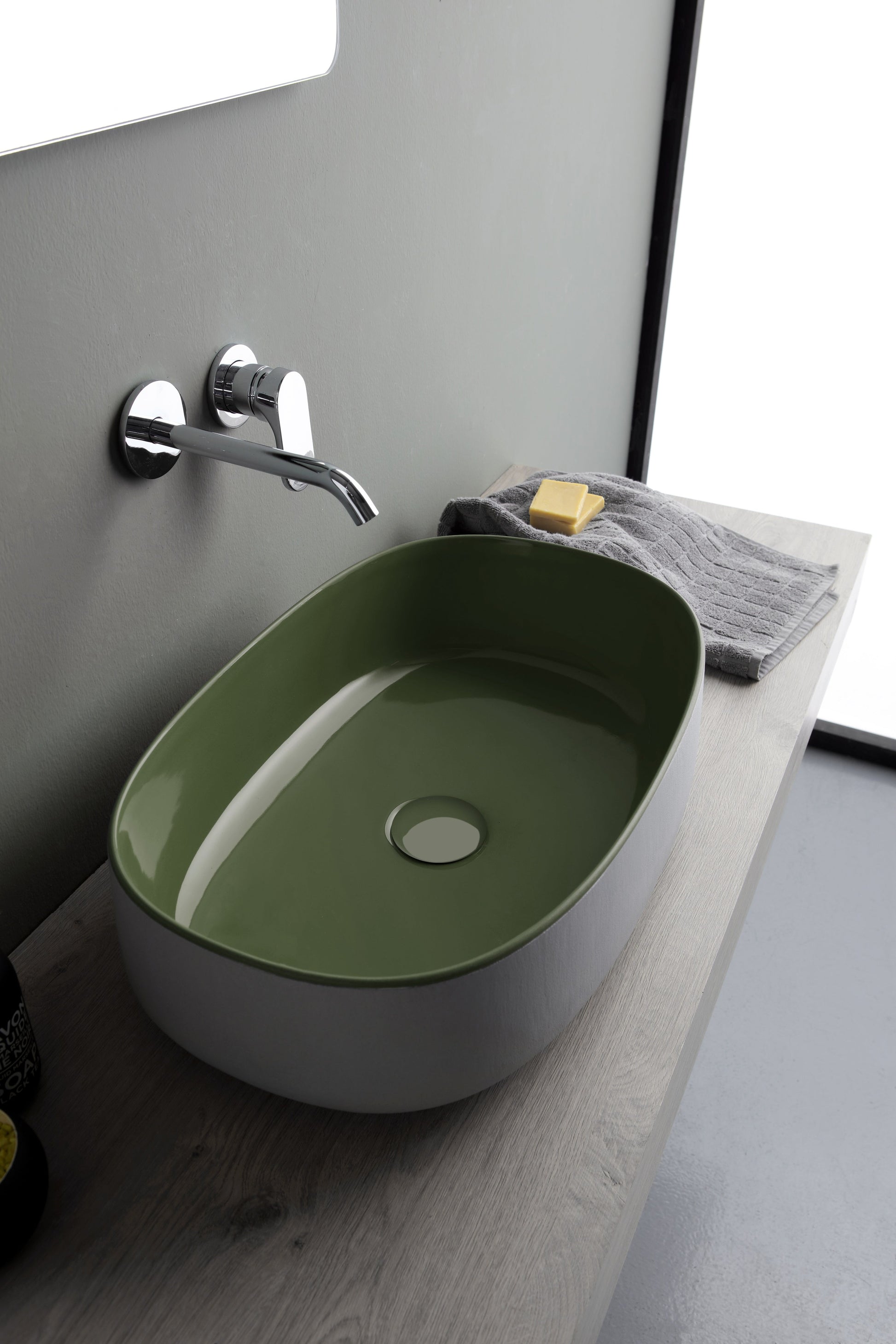 Keramikwaschbecken auf der Arbeitsplatte, Außenseite aus Öko-Mörtel mit Betonoptik, Keramikbadewanne in verschiedenen Farben.