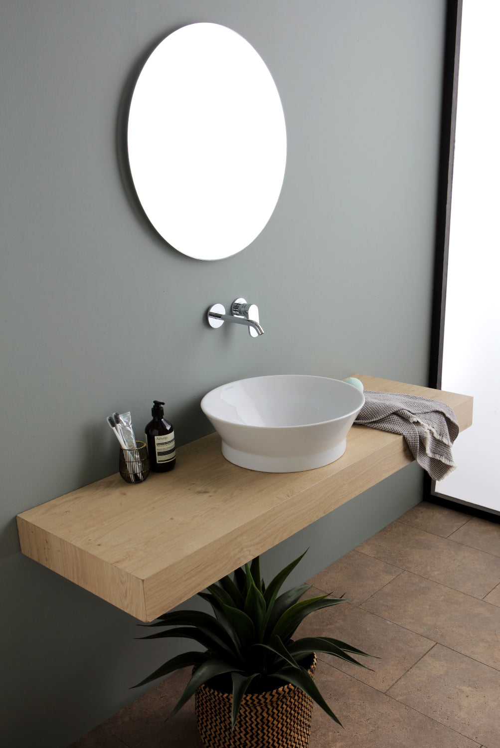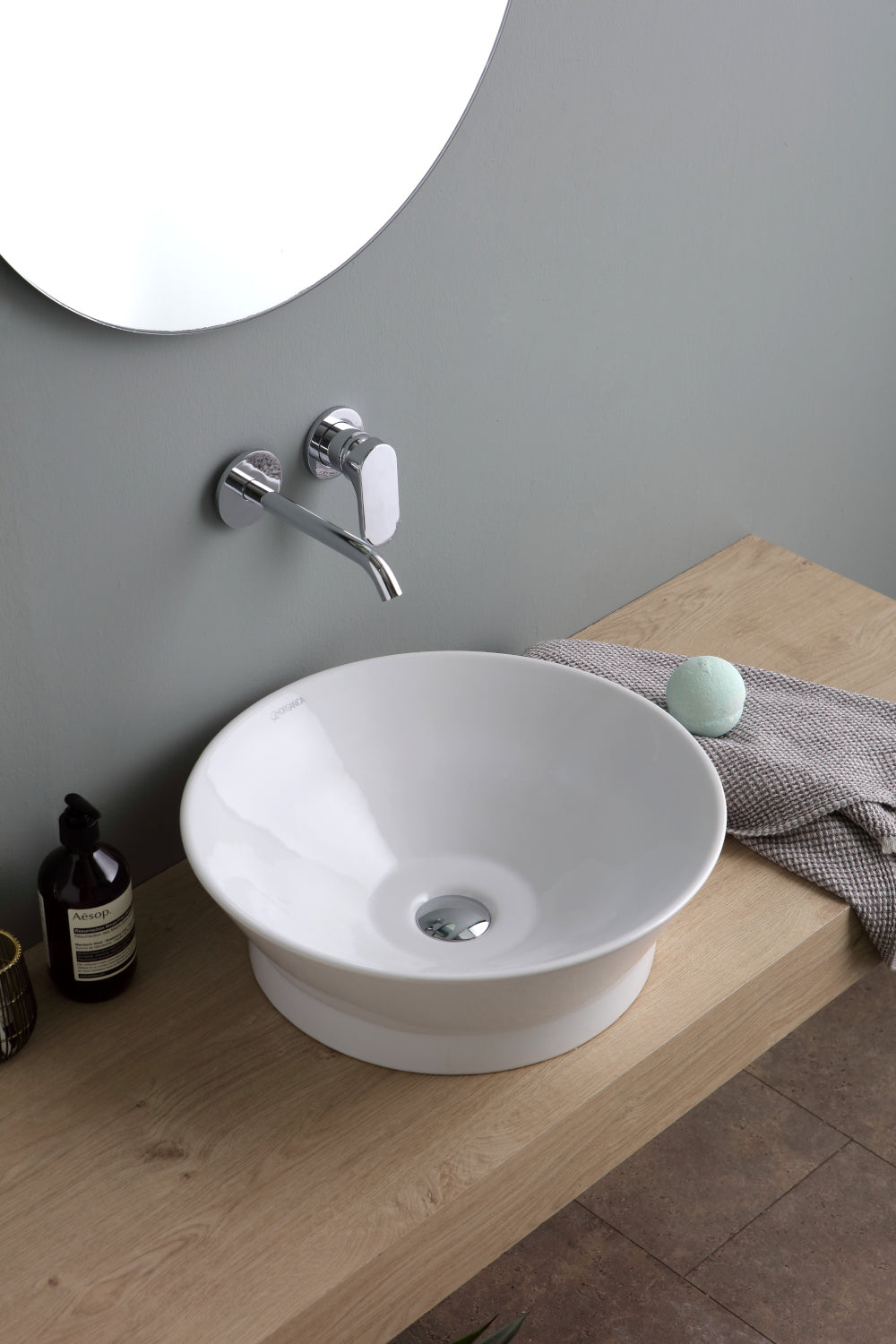Aufsatzspüle, Außendurchmesser 45 cm x Höhe 15 cm. Ablaufgarnitur mit Clipverschluss und Keramikabdeckung für den Ablauf nicht enthalten. Rahmen und Zubehör nicht enthalten.