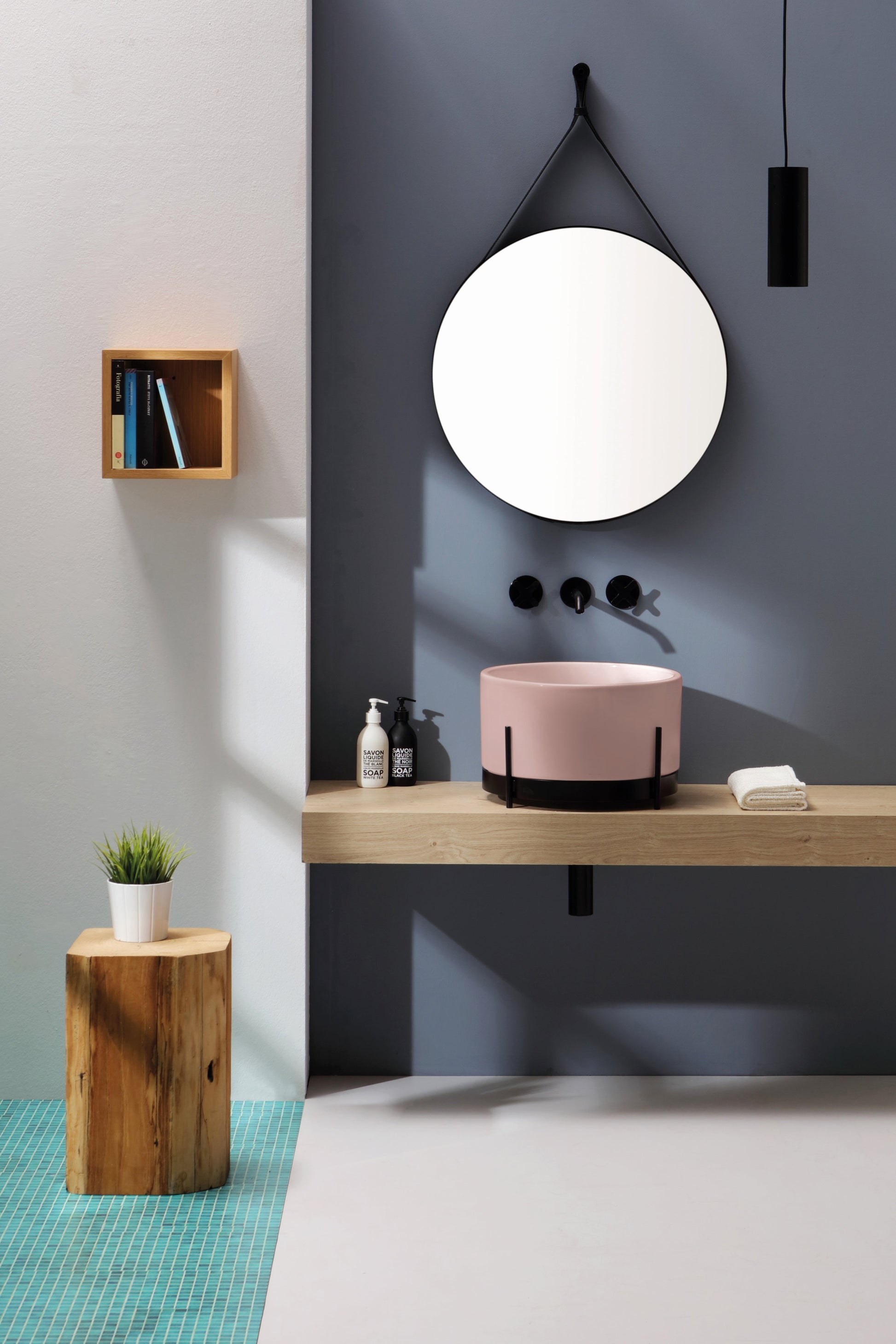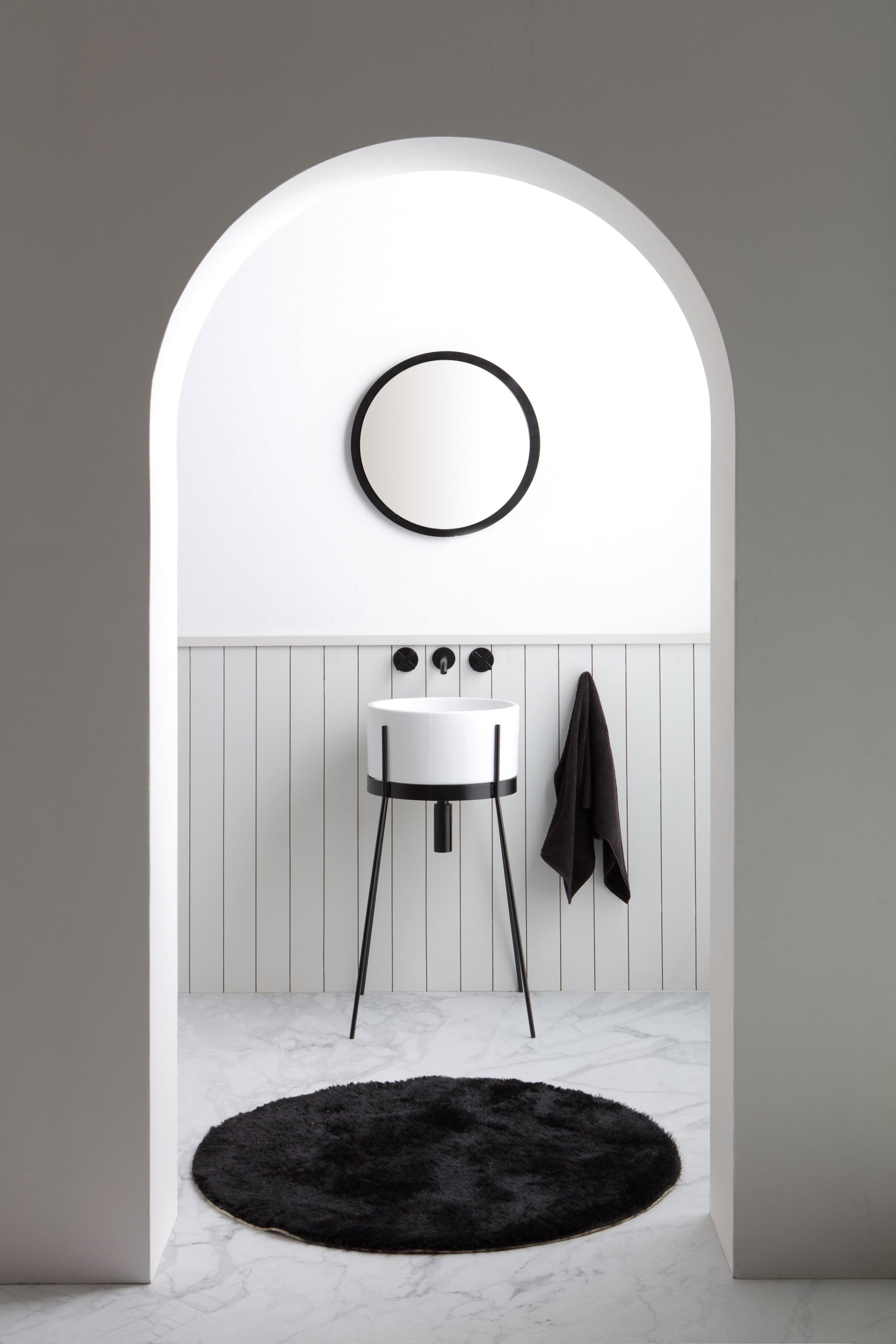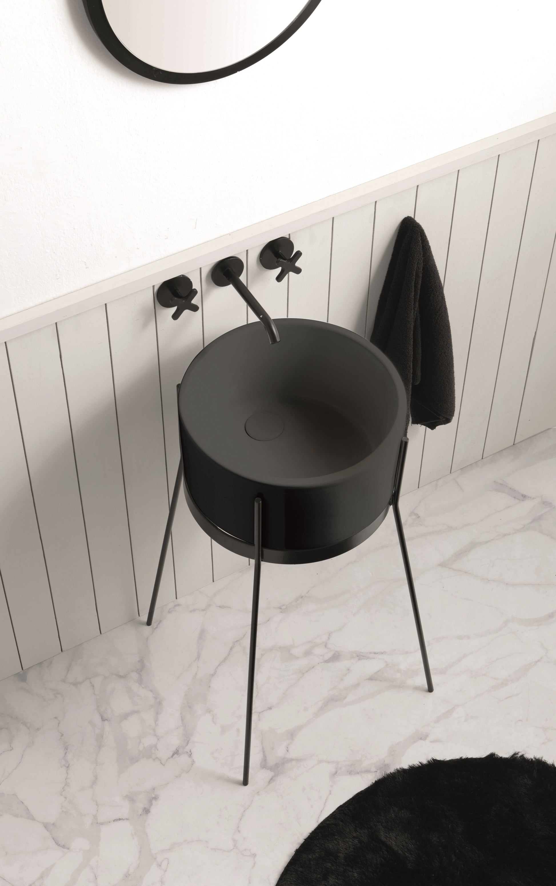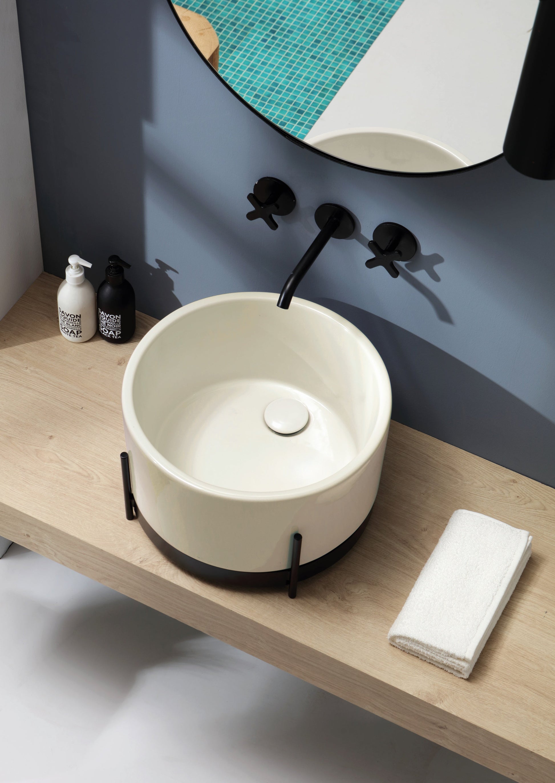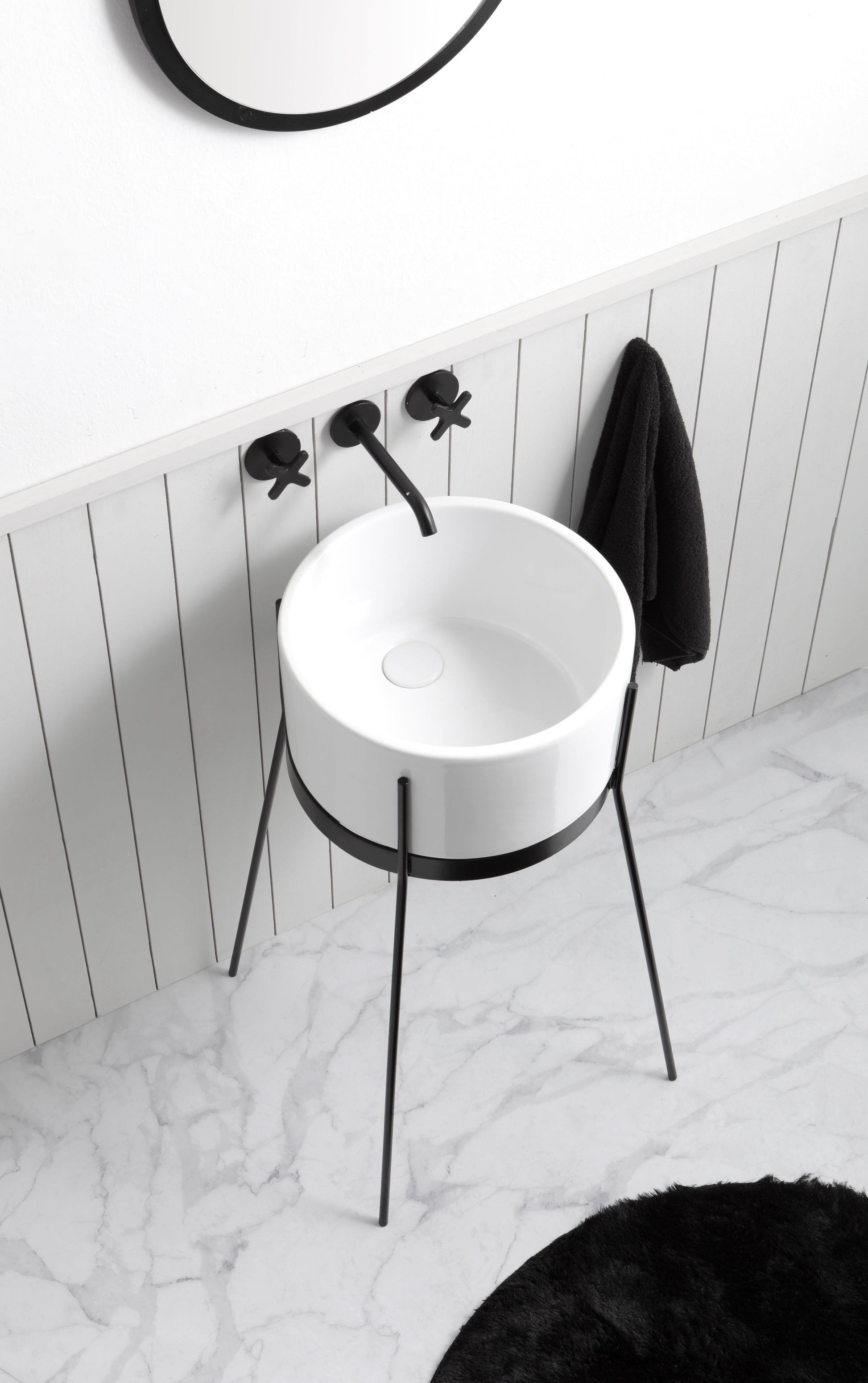Rundes Aufsatz- oder freistehendes Keramikwaschbecken mit hohem oder niedrigem Metallgestell, erhältlich in Schwarz oder Weiß