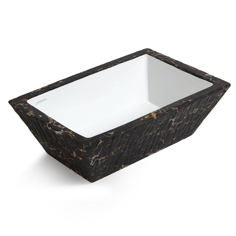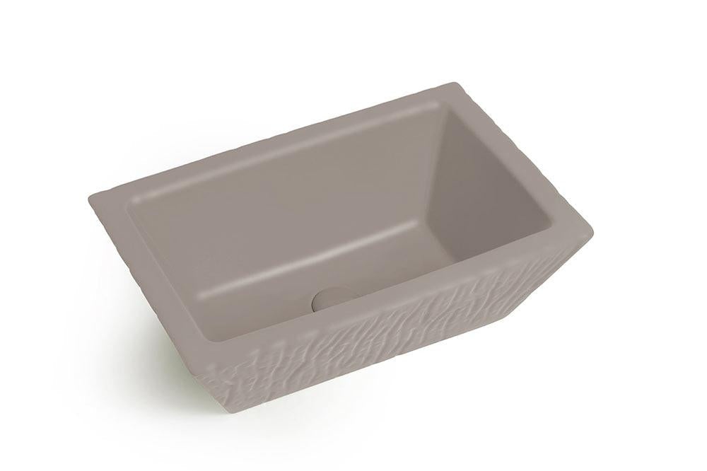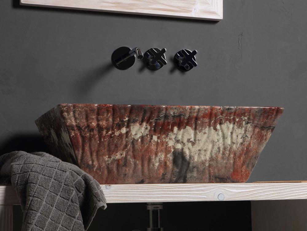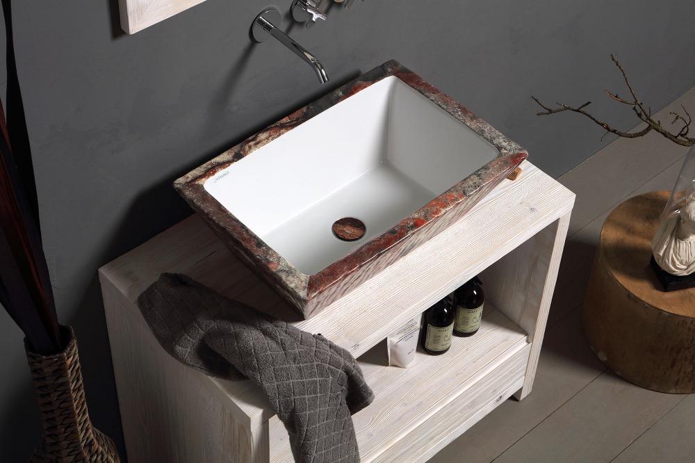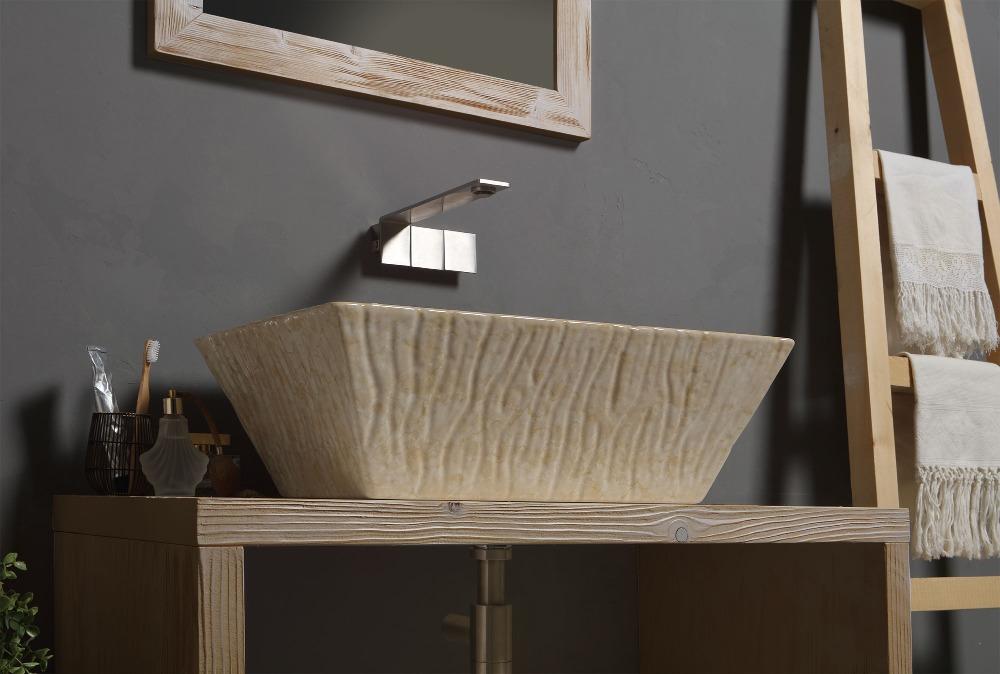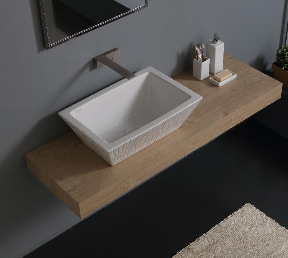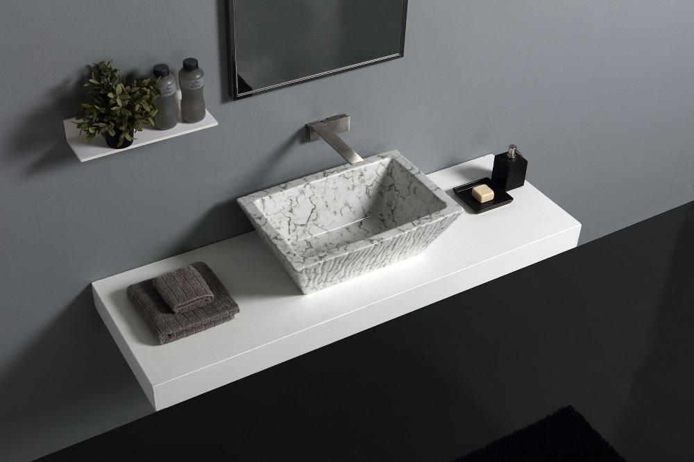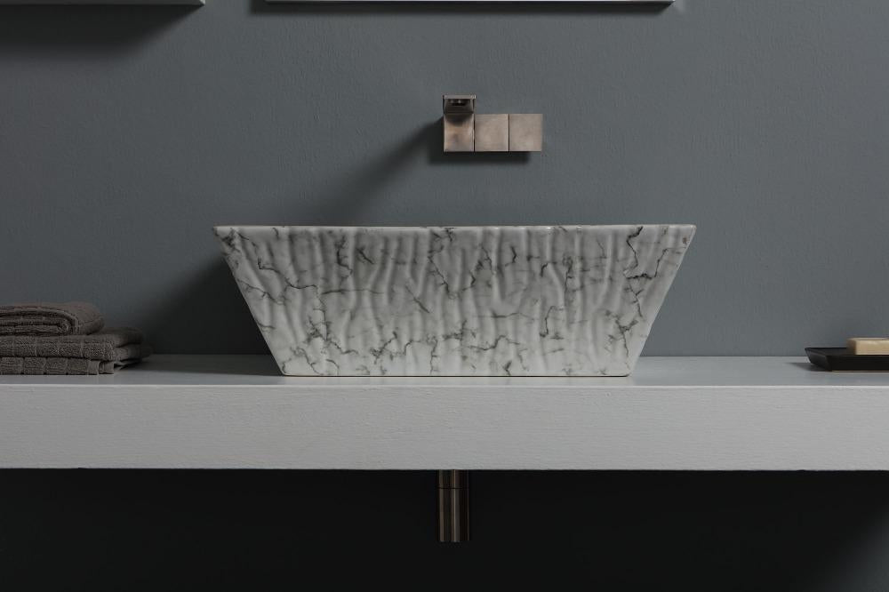 Keramikwaschbecken zur Montage oder Wandmontage mit speziellen Verzierungen, die den Effekt von Naturstein erzeugen.